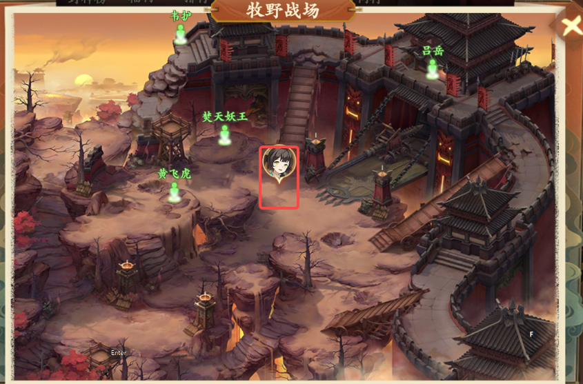 2、对话结束后前往牧野战场如图所示处与看守山贼对话