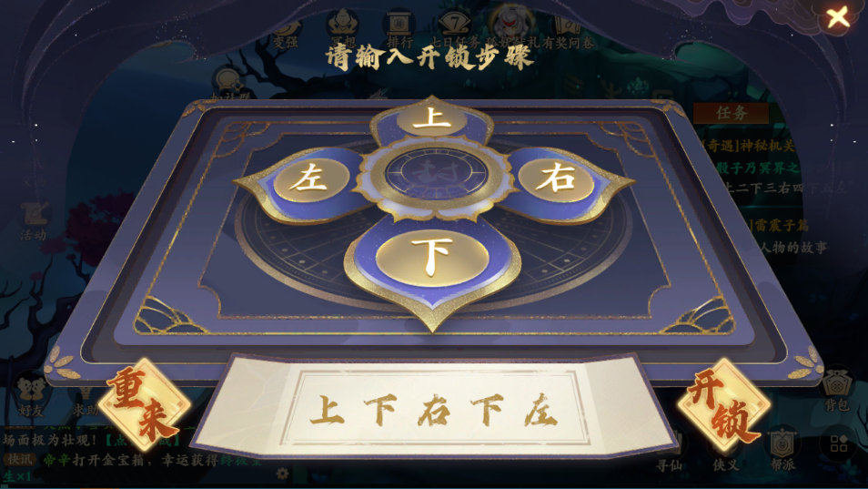 3、对话后按照“上下右下左”的顺序点击对应的图标输入,最后点击开锁即可