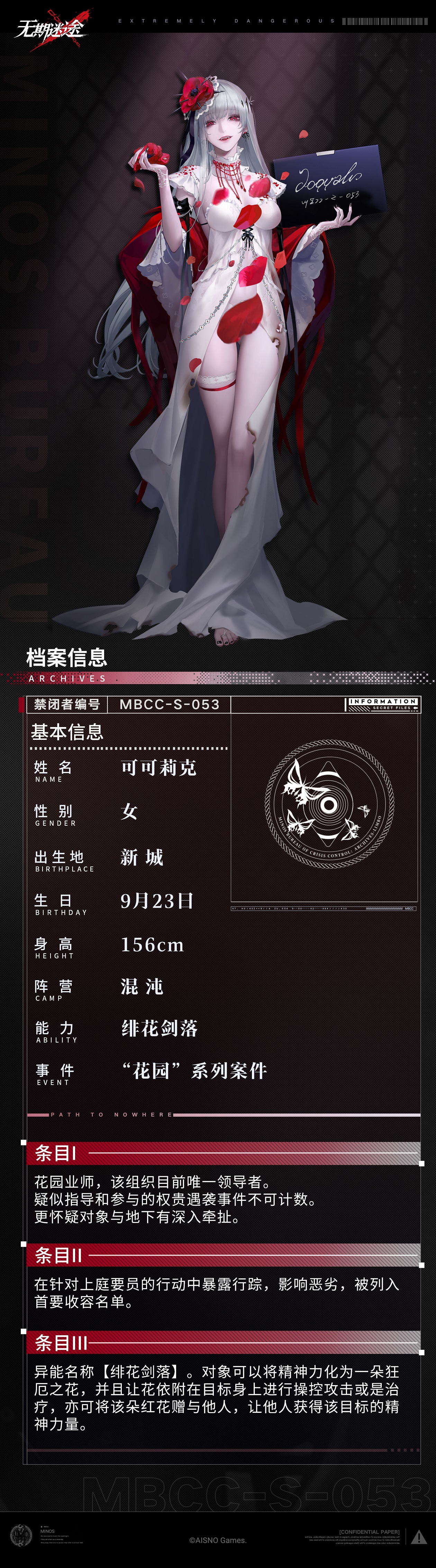 *条目III:异能名称【绯花剑落】。对象可以将精神力化为一朵狂厄之花,并且让花依附在目标身上进行操控攻击或是治疗,亦可将该朵红花赠与他人,让他人获得该目标的精神力量。