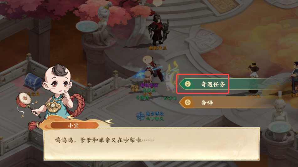 1、前往朝歌如图所示位置与小宝对话,领取奇遇任务