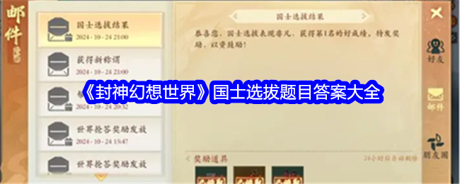 封神幻想世界国士选拔题目答案是什么?游戏中国士选拔是游戏中的一个答题活动,玩家可以通过参与答题活动获得大量的奖励,下面小编就给大家带来了《封神幻想世界》国士选拔题目答案大全,大家遇到问题可以看看有没有答案哦!
