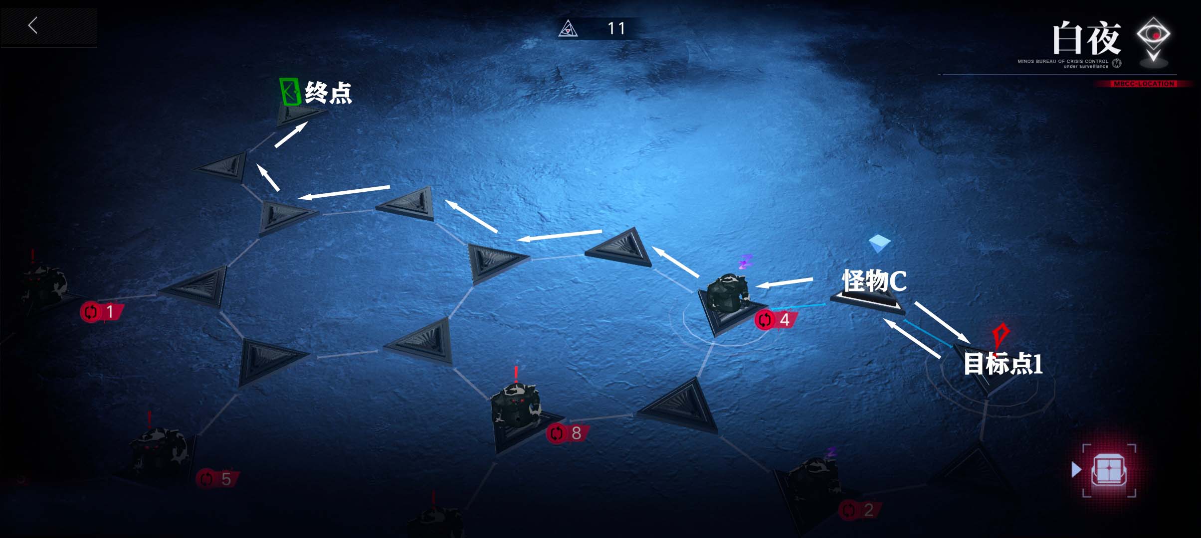 4.前往右侧目标点1,之后返回,一路前往终点即可(结束时剩余理智值2)。