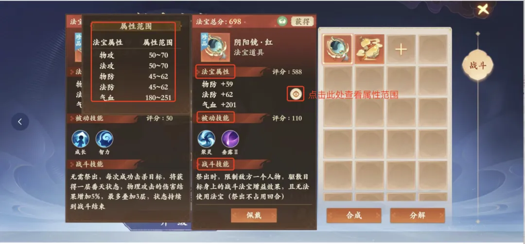 2.合成后,主法宝的属性词条,类型不变,数值重新随机变化,有几率提升品质,合成后进行二选一(合成时一定要注意看好主法宝的类型、法宝属性!!!)。可以放弃。