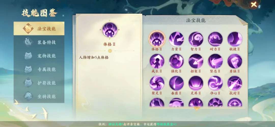 属性(2⭐️):当前法宝基础属性增加3%/6%。收益:根据基础属性波动收益不稳定,物攻、法攻(5-7),物防、法防(2.7-3.9),气血(7.2-15)