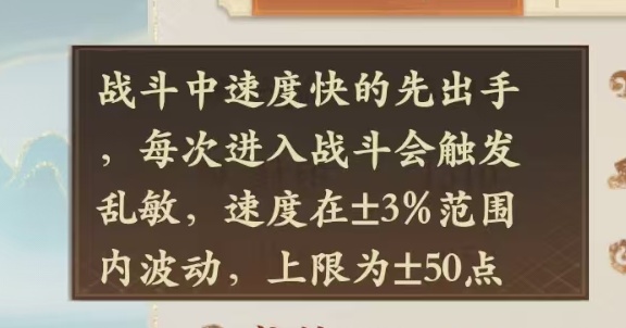 【战斗中,速度快的先出手,每次进入战斗会触发乱敏,速度在±3%范围内波动,上限为±50点】