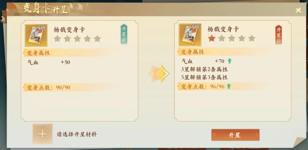 变身卡等级:最多可以升级到5星,成功升1星都可以增加属性数值,增加变身点数,升级到3星可以解锁2条属性,升级到5星可以解锁3条属性注意:升星需要消耗其他变身卡,消耗的卡片等级,次数都没有限制,等级越高剩余的变身次数越高,升星的概率就越大,注意不是100%升星的!!