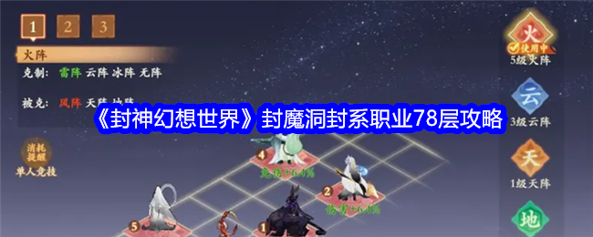 封神幻想世界游戏中封魔洞是闯关玩法,本次给大家带来了《封神幻想世界》封魔洞封系职业78层攻略,阵容推荐:慈航,青丘(必带),俩法师。阵法推荐:冰火雷天,三输出的都行。