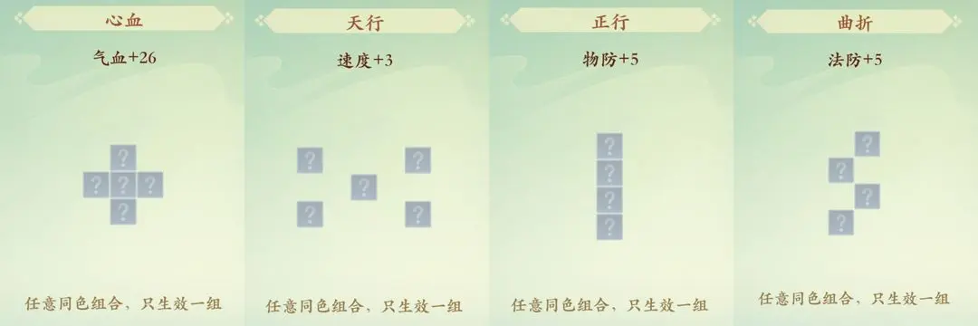 【根基图案】有4种,不限制方块颜色,但是需要颜色相同的色块,4个为1组,是比较基础的色块搭配,不够10个的时候可以先组3个根基图案来过渡,等可以组悟性图案的时候也可以当做边角料来补充属性