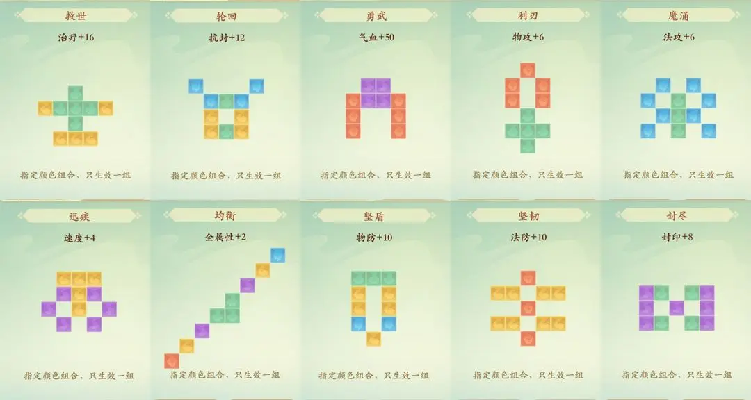 【悟性图案】要求会更高,需要的色块更多,基本是10个11个起拼,且色块颜色也有固定要求,但是但来的属性也更加强力。悟性图案目前有10种,效果如下: