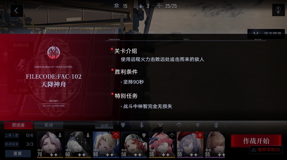 第一关没什么难度,可以上阵6人,需要使用远程角色且坚持90秒,建议大家多带一些精准或者异能角色,手短的近战角色请暂且放弃。另外如果是练度低要凑人的话可以带普攻能攻击的奶妈,毕竟也是手长攻击角色。