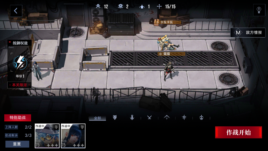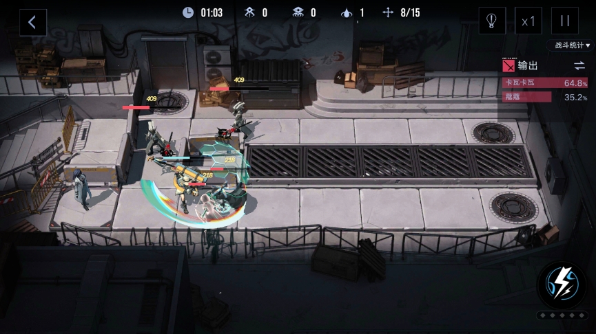 然后蔻蔻挪到前面的初始位置,卡瓦卡瓦解决完手上的敌人也挪去前面打一下敌人,这里后面虽然也会出怪但是出的是远程怪,站在远处不好打。