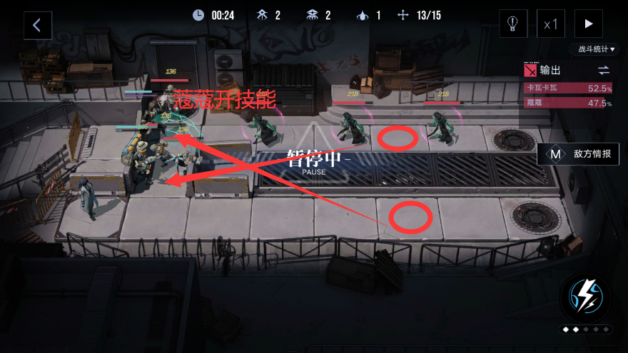 蔻蔻处理完面前的敌人后挪到卡瓦卡瓦上面挡住敌人,并且开启蔻蔻技能。然后给卡瓦卡瓦冲能一次。
