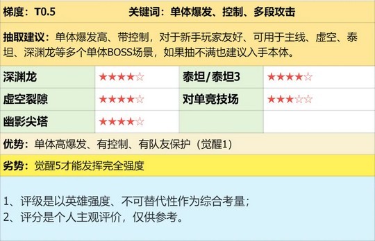 除了公会龙以外,在主线、泰坦、虚空裂隙、对单竞技场(非顶级)等模式也能打出较高的单体输出。