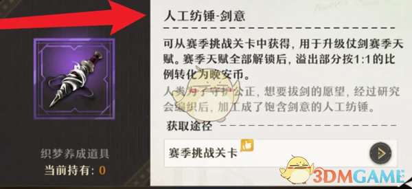 人工纺锤-剑意是一个赛季的道具,用来升级仗剑赛季天赋,将赛季天赋全部解锁后,溢出的部分就会按照一比一的比例转换为晚安币,可以挑战赛季关卡内获得,不过很多玩家对这个道具的获取方法并不是太清楚,下面就让小编给大家带来《无尽梦回》人工纺锤剑意获得方法,感兴趣的继续往下看看吧。