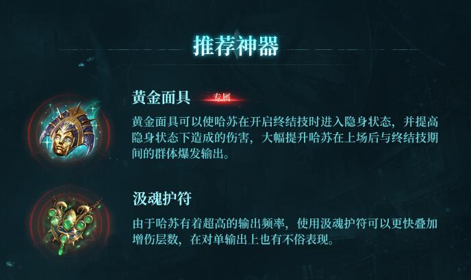 黄金面具可以使哈苏在开启终结技时进入隐身状态,并提高隐身状态下造成的伤害,大幅提升哈苏在上场后与终结技期间的群体爆发输出。