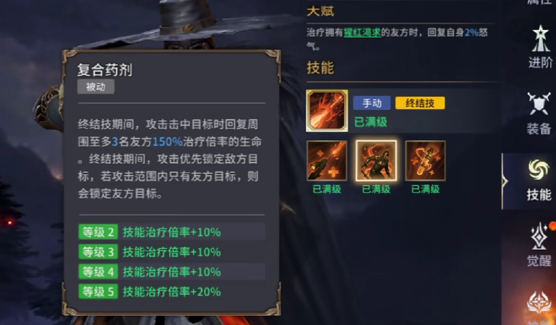 终极技能释放期间,攻击会优先锁定敌方的目标,如果攻击范围内只有友方目标,则会即可锁定友方目标,该技能属于攻防兼备的技能,在被动技能提升到最高时,治疗的倍率会提升百分之五十。