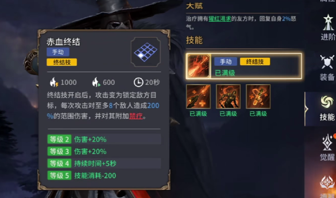 并且可以对敌人施加禁疗的效果,在该技能进行提升时,不仅能够提升40%的伤害,持续时间可以增加五秒,技能消耗的怒气值会减少两百。