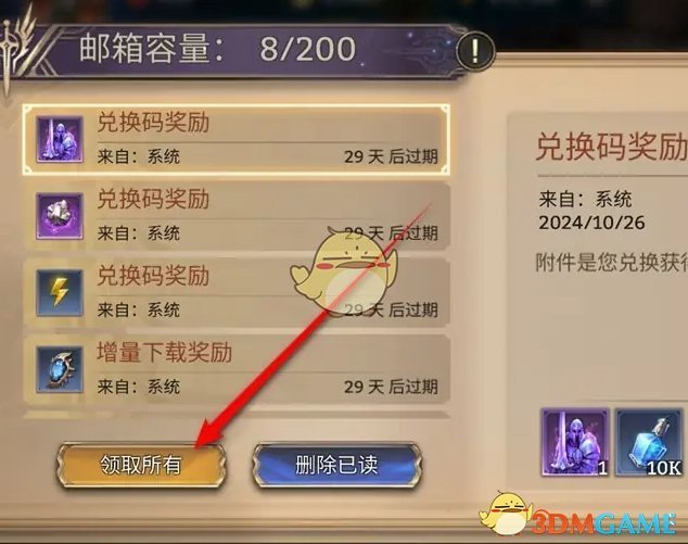 答:在邮箱内点击领取所有即可一键领取全部奖励