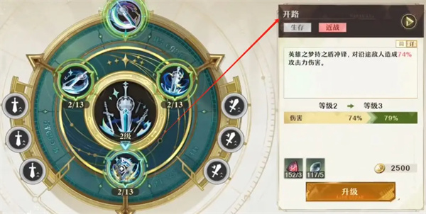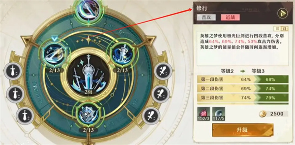 英雄之梦召唤极光巨剑,聚拢范围内敌人并造成430%攻击力伤害。此后英雄之梦进入【洗礼】状态,消耗能量值触发强化普攻效果,普攻四段分别触发【献之枪】、【勇之锤】、【慈之剑】、【谦之盾】攻击效果,造成192%、256%、321%、128%攻击力伤害。