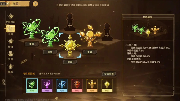 如图我们可以上阵3个角色,为队伍进入游戏锁定,生效三重共鸣:分别为三种流派各自的伤害提升