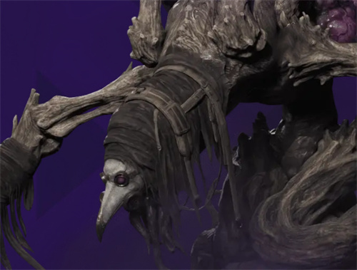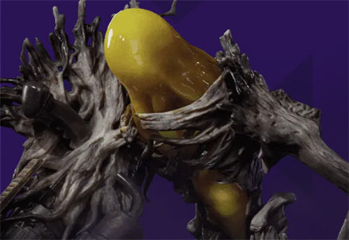 腐影猎手看起来像是—堆被黄色粘液从中间粘起来的骨架。透过骨头上的裂缝,你可以看到红色的星尘颗粒像血液一样流经它的身体,向各个部位输送能星。它的右手被很多触手嫁接在一个固定的机枪上,而它的另一只手被研磨成了骨质镰刀。