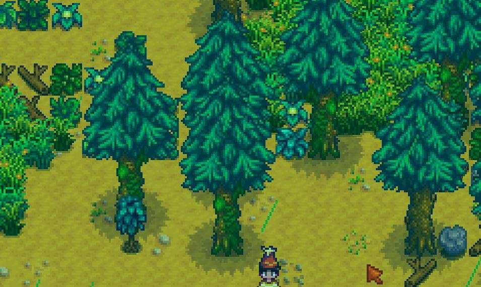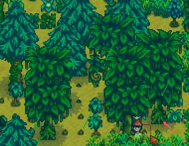 遇到其他树木我们虽然不砍,但是尽量都摇一摇,有概率掉落长满苔藓的种子,也就是图中绿色五角星形状的物品,后面可以在农场自己种绿雨树。