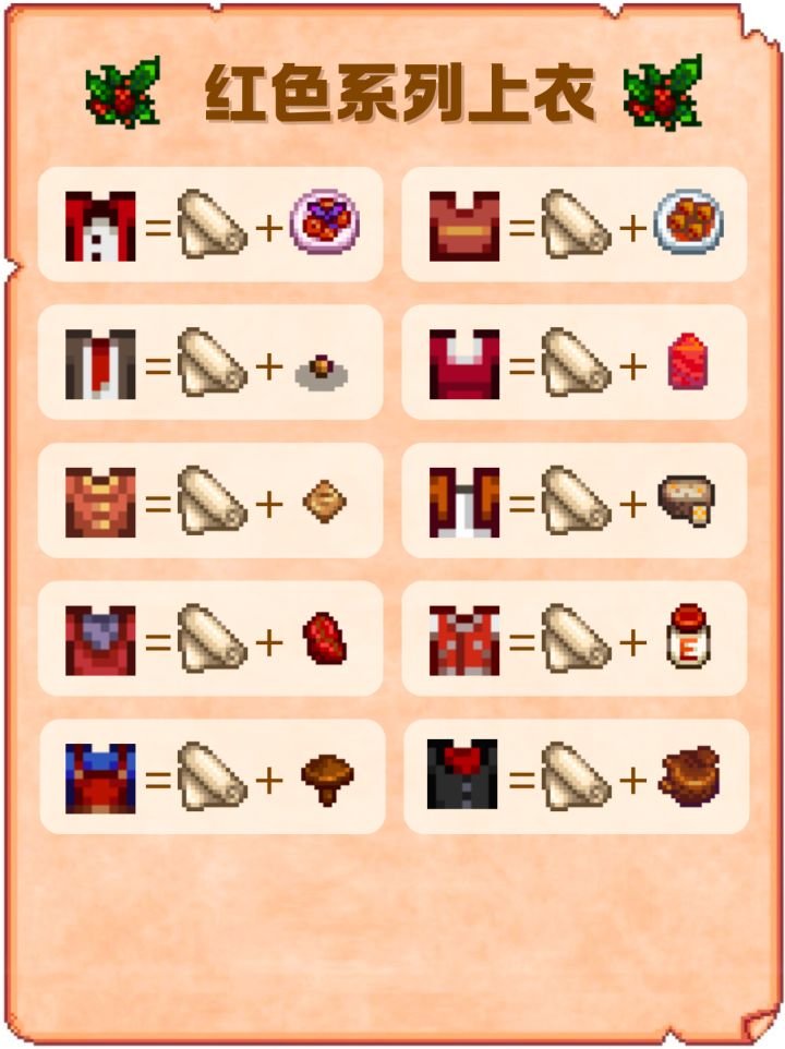 以上就是小编整理带来的星露谷物语红色上衣有哪些,红色系列上衣配方,更多相关游戏攻略,请关注手游网!