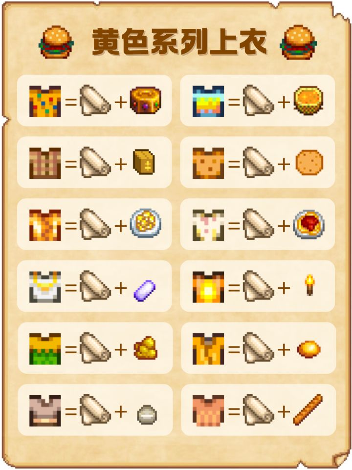 以上就是小编整理带来的星露谷物语黄色上衣有哪些,黄色系列上衣配方,更多相关游戏攻略,请关注手游网!