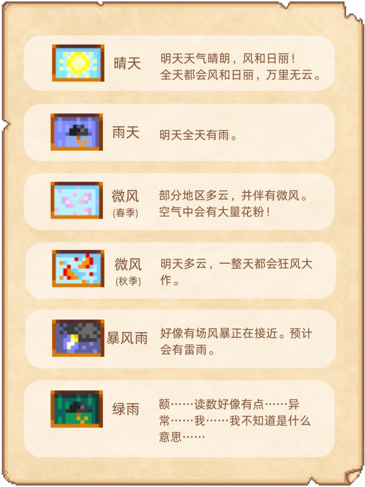 以上就是小编整理带来的星露谷物语中有哪些天气,天气指南,更多相关游戏攻略,请关注手游网!