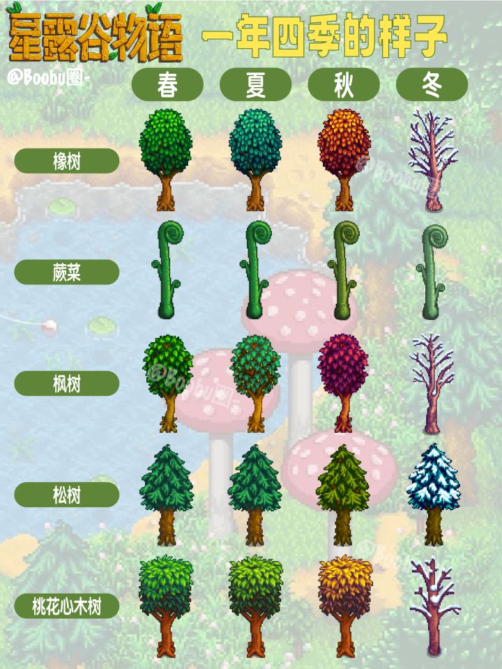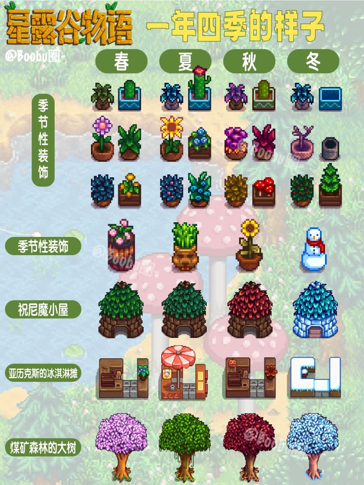 星露谷物语一年四季有什么不同,星露谷的一年四季植物、树木及装饰都有不一样的样貌,相信爱装修的老乡都注意到了,那么下面就来看看在不同季节下,这些物品都有什么外观上的变化吧。