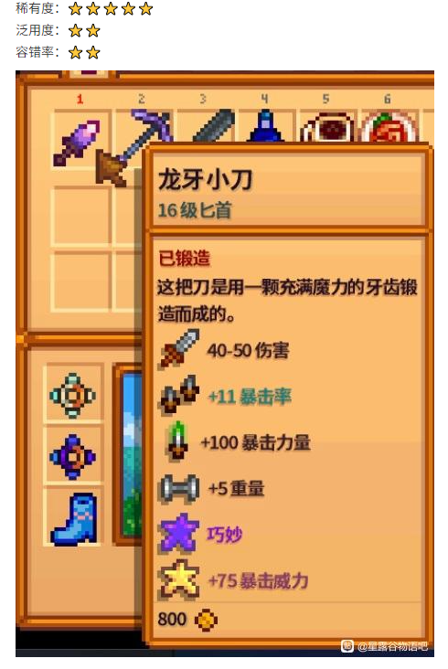 8u们一直在推荐这把,那就来说一下我的理解,和暴威铱针相比,获取难度太高,而且暴击率低就意味着你需要更多的buff(运气,戒指或是祝福),单铱环右键暴击情况下,暴威铱针大约是800-1300+的伤害,龙牙小刀则是1000-1300+伤害,秒怪变得更加稳定,如果你遇到好运天或者是利齿祝福那么才能真正激发出它的潜能,至于为什么不推荐暴击率附魔,额,要暴率为什么不玩针