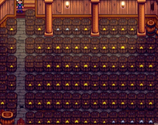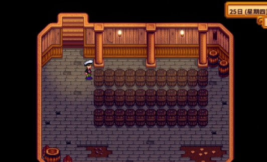 2、这种摆放会让地窖没有能行动的空间,从摆放上就要从最下方的边缘有规划的挨个放置木桶和果酒,等到56天之后收成时,通过更高品质的锄头,蓄力大范围的敲掉木桶,就能将地窖内的所以铱星果酒收获。