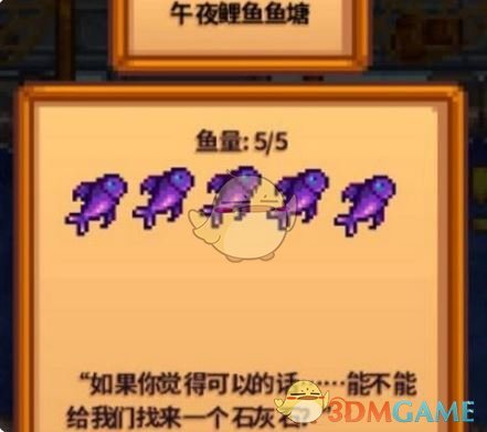 2、鱼塘任务:鱼塘里的鱼会以固定速率繁殖至鱼塘当前的容量上限。完成鱼塘任务可以增加该鱼塘的容量,最大容量为10(传说鱼类和传说鱼类二代则为1)。当鱼的数量达到鱼塘当前的容量上限时,鱼塘就会发布一个任务,此时在鱼塘中心会出现一个感叹号标志。
