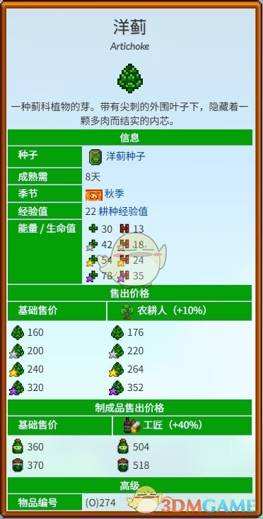 洋蓟是星露谷物语游戏内的蔬菜类农作物,可种植洋蓟种子,在第8天后即可成熟,洋蓟的种子是咋第二年秋季前往皮埃尔的杂货店内购买获取的,洋蓟可以给NPC赠送提升好感度,还可以制作食物,那么洋蓟的具体获得方法是什么呢?小编整理了《星露谷物语》洋蓟获得方法,一起来看看吧。