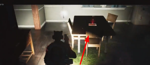 3、进入房屋后,可以看到一个带有红色标记的桌子。