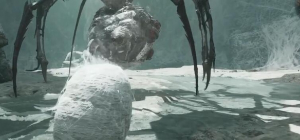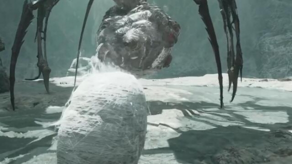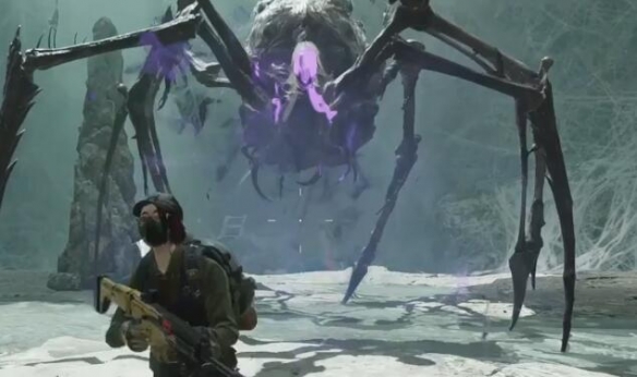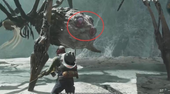 1、来到下图位置后可以看到boss,需要注意蜘蛛的弱点在胸前和尾巴的发光位置