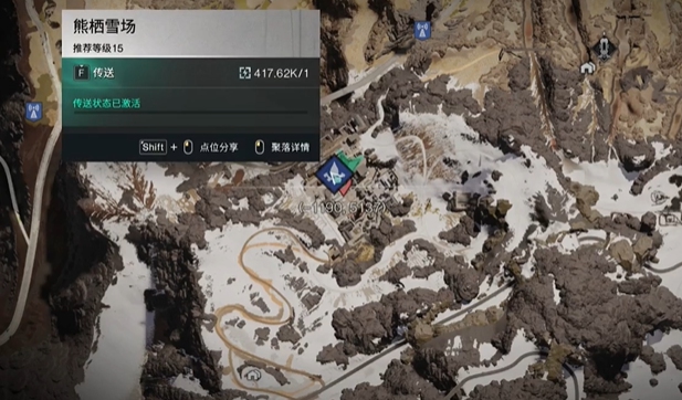1、进入游戏后打开地图,前往熊栖雪场(1190,5137)处