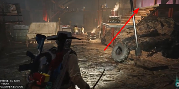 3、沿着楼梯往上走,来到油桶上方位置。