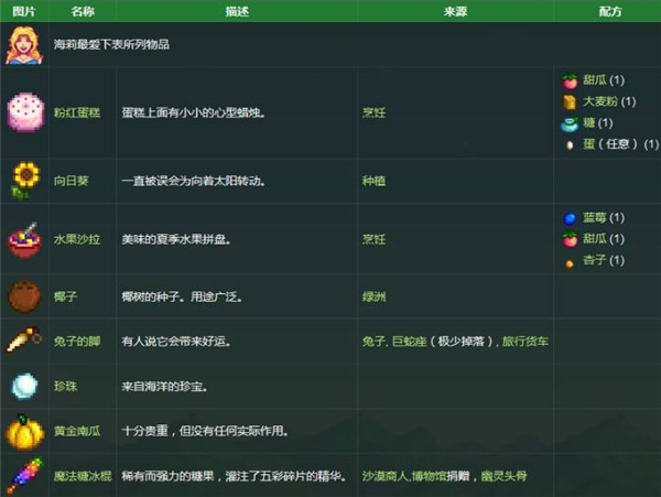 海莉最爱的物品:粉红蛋糕、向日葵、水果沙拉、椰子、兔子的脚、珍珠、黄金南瓜和魔法糖冰棍