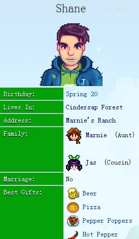 谢恩的位置是不固定的:早上7:00从玛尼的农场准备出发去jojamart干活;早上9:00~下午5:00在jojamart干活;下午6:00在saloon里待到晚上11:00;12:30回到玛尼的农场睡觉。玩家需要通过时间来判断谢恩的位置。