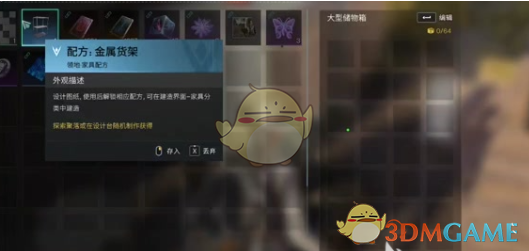 金属货架作用:增加储物空间的道具,如若没有获得也可以选择用集装箱短暂替代金属货架的储物功能。