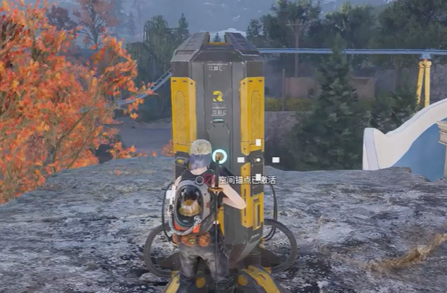 在跳车后,我们继续往小地图六点方向的空间锚点走,激活它之后,我们就能飞到附近的一块石头边缘,下面就是一个观景点,别忘了拍下风景。接着,我们进入旁边的建筑,沿着路线走,翻过饮料机后,你就会看到一个充电邮筒,旁边有一个电池。先往右转,进入饮料机房,爬上石柱,你就能看到第一个电池,拿到之后,原路返回,再去对面的房间。