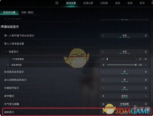 4、进入后,找到威胁显示,点击右侧的箭头即可在2D和3D图标之间切换。