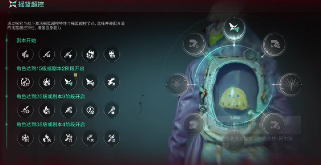 要说摇篮系统的具体玩法是借助科技树跟动态词条的机制,给玩家呈现出相对自由的技能定制体验。在这个系统中玩家需要解锁第1个boss那就是浮影猎手,借助密钥跟转能电池,就能够逐步激活四大类的配方,这里的四大类分别为采集,工艺,经营,建造。随后玩家借助升级,就能够解锁多个摇篮节点。