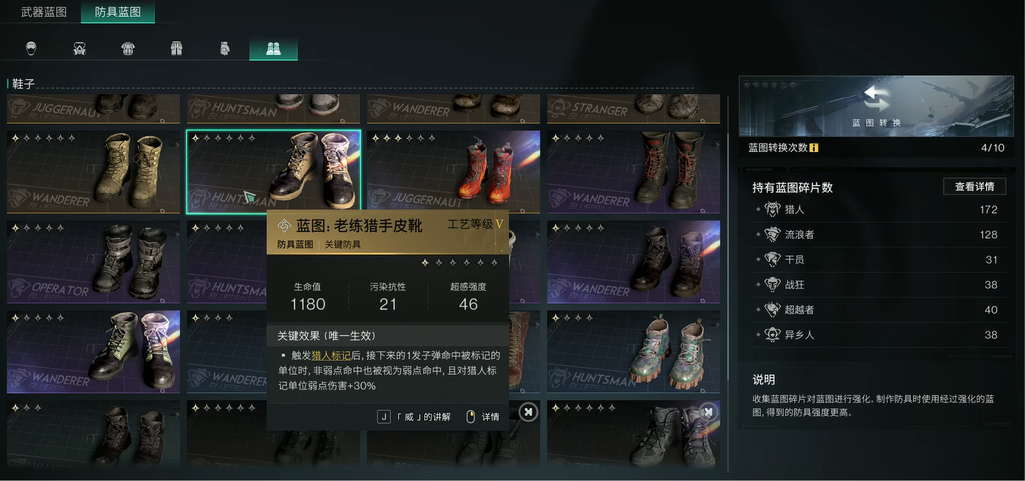 鞋子上的话,可以选择老练猎手皮靴。当你触发猎人标记后,接下来的一发子弹命中被标记的单位时,非弱点命中也被视为弱点命中;且对猎人标记单位弱点伤害加30%,这个效果非弱点命中也被视为弱点命中,就算boss本身没有任何弱点,依旧可以在他身上打出弱点伤害。