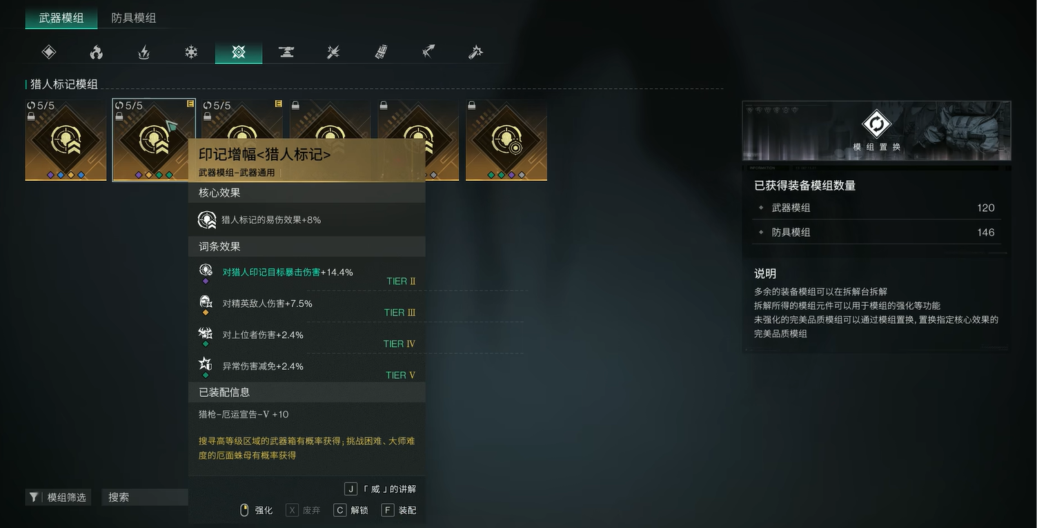 武器模组方面的话,这里优先选择印记増幅<精准>。不仅可以提升易伤效果,又可以增加弱点伤害和枪械伤害,所以可以轻松增加不同乘区的伤害。副武器上的模组推荐用持续快枪<快枪手>,可以让你在快枪手状态下,提升状态持续时间以及伤害。