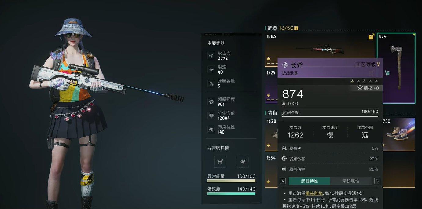 近战武器推荐大家带一个长斧:重击每命中1个目标,所有武器暴击率+8%,近战挥砍速度+5%,切换武器后就可增加主武器的暴击伤害。
