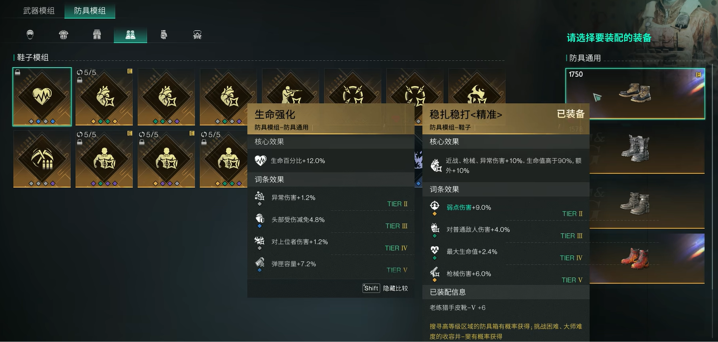 至于头部模组的话,就推荐大家用精准打击,同样可以增加弱点伤害。衣服模组的话,可以选择快速返场,可以提升弱点伤害的同时还带来庇护效果,增加生存能力。裤子模组的话,就可以用百步穿杨<精准>,同样可以提升弱点伤害。最后鞋子的话,就可以选择用稳扎稳打,除了可以提升弱点伤害之外,还能增加额外10%伤害,更令人喜爱!