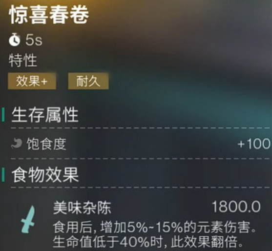 惊喜春卷的基础属性十分出色,提供了+100的饱食度,这意味着玩家食用后能够得到明显的生存加成。在食物效果方面,惊喜春卷带有“美味杂陈”的效果,食用后会增加5%至15%的元素伤害,这对于依赖元素攻击的玩家来说无疑是一个巨大的增益。而且,当玩家的生命值低于40%时,效果会翻倍,最多可增加30%的元素伤害,这一特点使得惊喜春卷在危机时刻显得尤为重要。