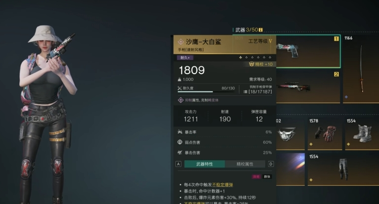 在防具套装选择上孤狼套装是首选,三件孤狼套装不仅能增加弹匣容量,为持续输出提供保障,还能给予额外的暴击属性加成,并且其套装效果可增加暴击伤害,这一系列加成与大白鲨高爆发的特性相得益彰,能极大提升大白鲨的输出能力,使它在战斗中的表现几乎可与步枪相媲美,无论是应对小怪群还是挑战BOSS,都能游刃有余,倘若没有孤狼套装,可采用庇护者套装加上重装套装进行过渡,对于暴击率较低的玩家,将重装套装替换为猎鹰套装是不错的选择,猎鹰套装能有效增加暴击率,有助于提升大白鲨的整体伤害输出稳定性。